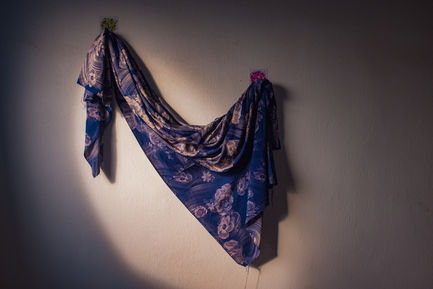 Cloth artwork infused with soil, yarn, crushed kemenyan, black pepper, ash, wax and soothed with Snake Brand Prickly Heat Cooling Powder, Sam Fong Hoi Tong Talc Powder (Bedak), jasmine oil, lemongrass, turmeric and sweat